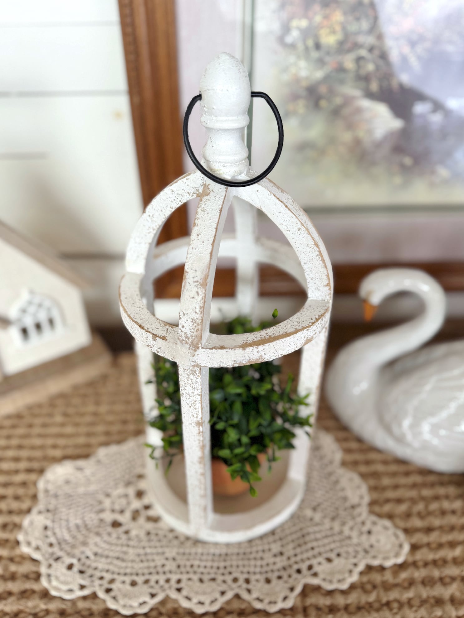 Distressed White Wood Lantern with Metal Hanger