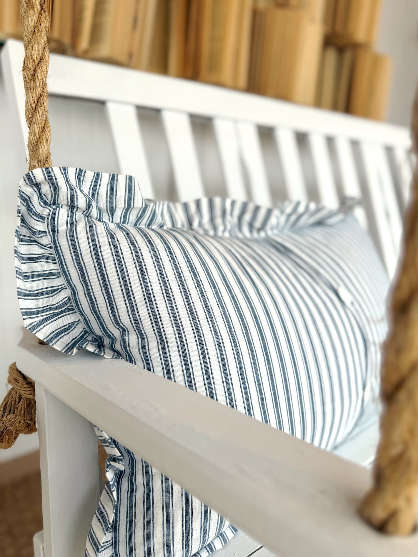 Blue Stripe Ruffle Throw Pillow – Add timeless charm to your space with this denim blue and white ticking stripe accent. The 14×22-inch pillow features a classic ruffle edge and soft cotton fabric for that relaxed, just-right finish.