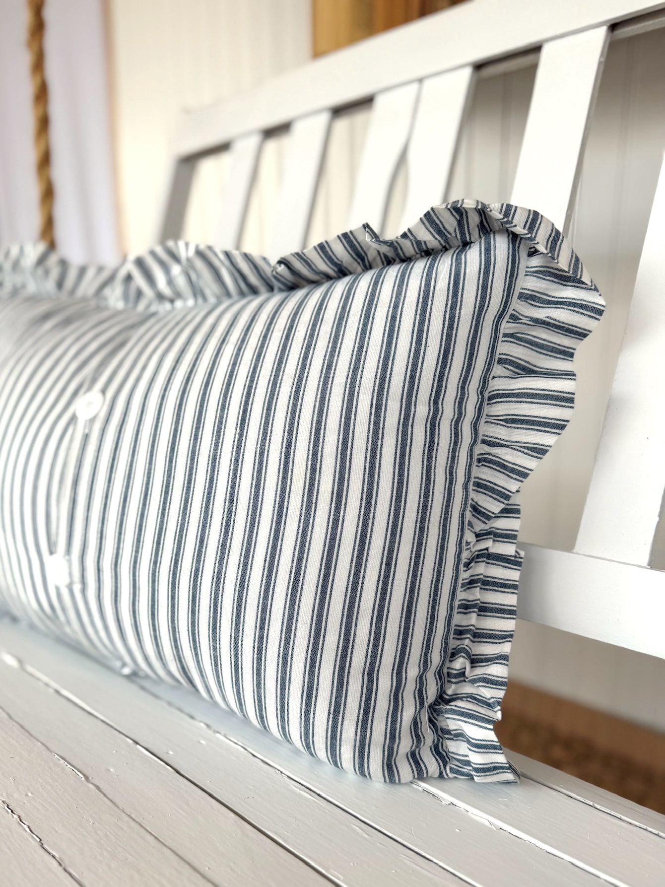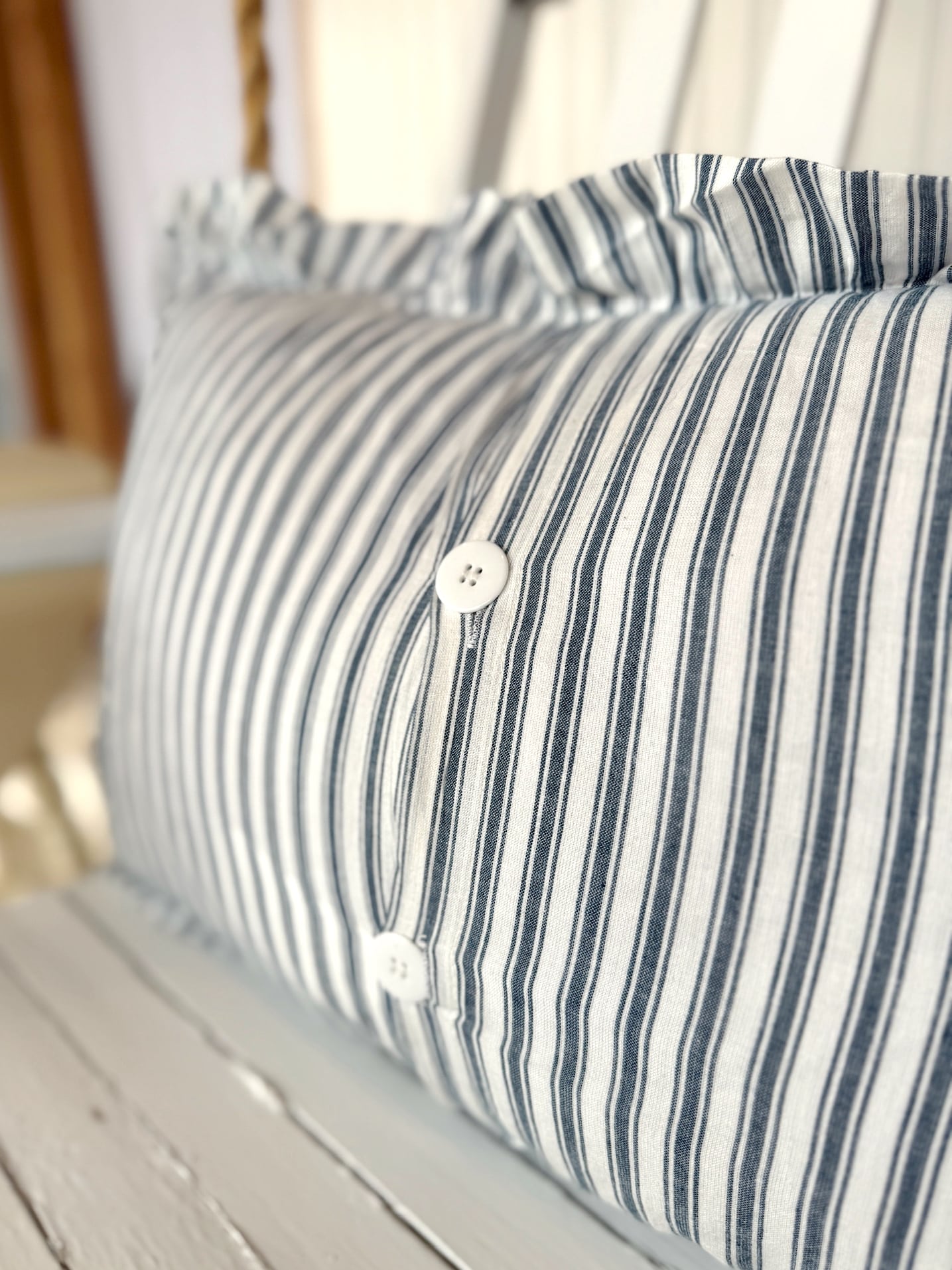 Front and back share the same ticking stripe pattern, with button-style closures that make cleanup a breeze. It’s machine washable, tumble dry low, and iron safe—because pretty should also be practical.