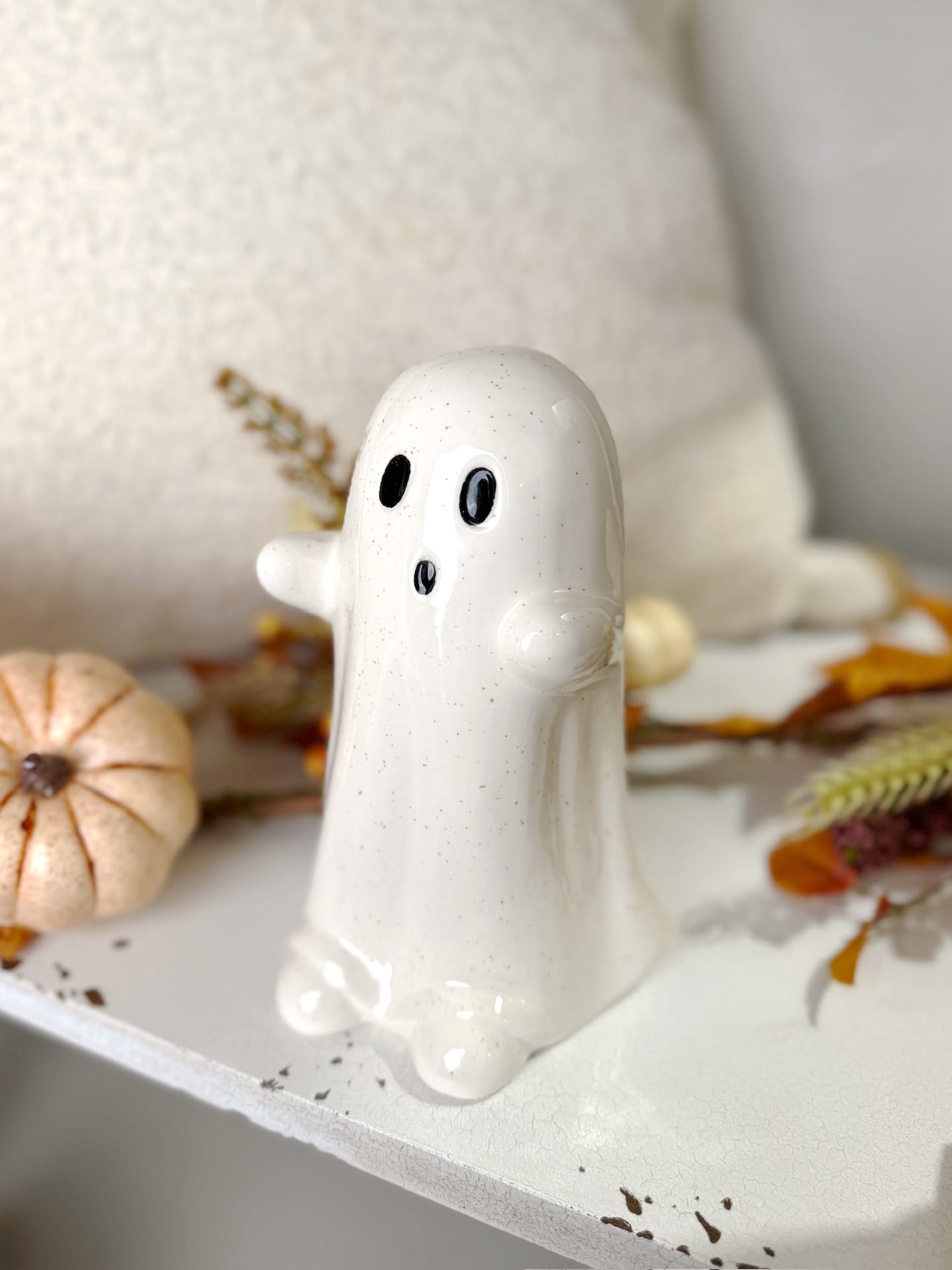 Crafted from ceramic with a smooth glazed finish, it stands freely on any flat surface. Whether you place it on your mantel, bookshelf, entryway table, or mix it into a spooky centerpiece, this ghost is more cute than creepy. A fun and easy way to bring whimsical Halloween vibes to your home.