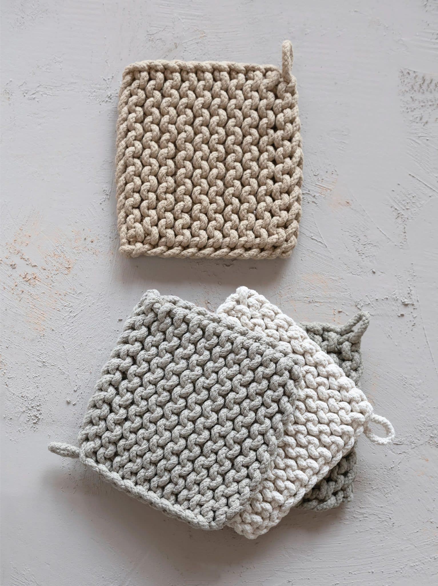 With a chunky knit weave and clean loop for hanging, this 8″ x 8″ square adds a cozy, minimalist look to any space. Choose from four neutral shades—gray, light gray, cream, and tan—for a timeless palette that blends effortlessly into modern, rustic, or classic kitchens.