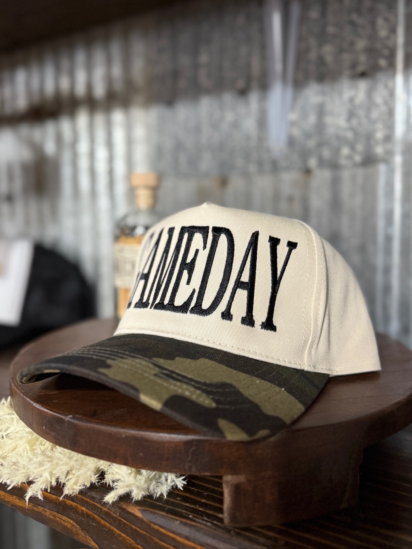 Bring the energy on and off the field with the Gameday Camo Embroidered Trucker Hat. This standout piece features bold black embroidery across a natural cotton front with a rugged camo bill—a combo that’s both classic and right on trend. Camo continues to be a go-to look for game days, adding that perfect mix of sporty and stylish to any outfit.