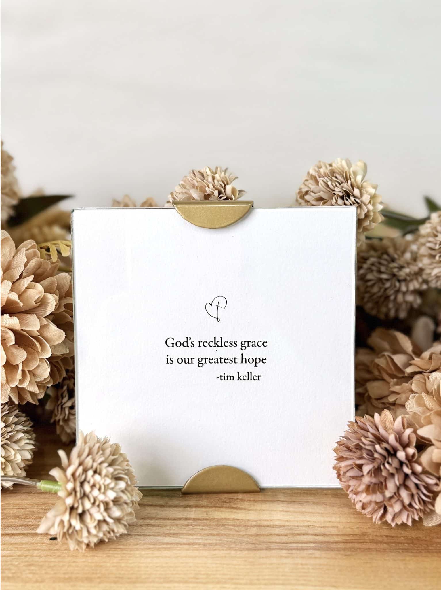 Share a powerful reminder of faith and hope with the God’s Reckless Grace Scallop Frame. Featuring the meaningful quote—“God’s reckless grace is our greatest hope”—this 3×3 frame creates a light and uplifting look with its clear glass panes and soft gold scalloped corners.