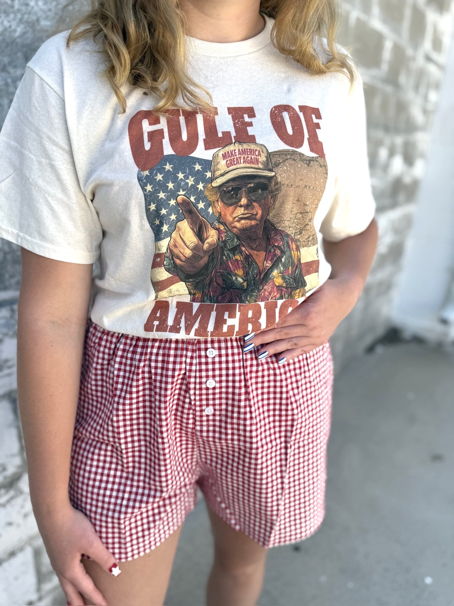 Make a bold, patriotic statement in our Graphic Tee – Gulf of America White. This version features the eye-catching graphic front and center on a classic white tee. The design includes a colorful, tropical-shirted character standing in front of an American flag and vintage map. It’s playful, nostalgic, and ready for summer.