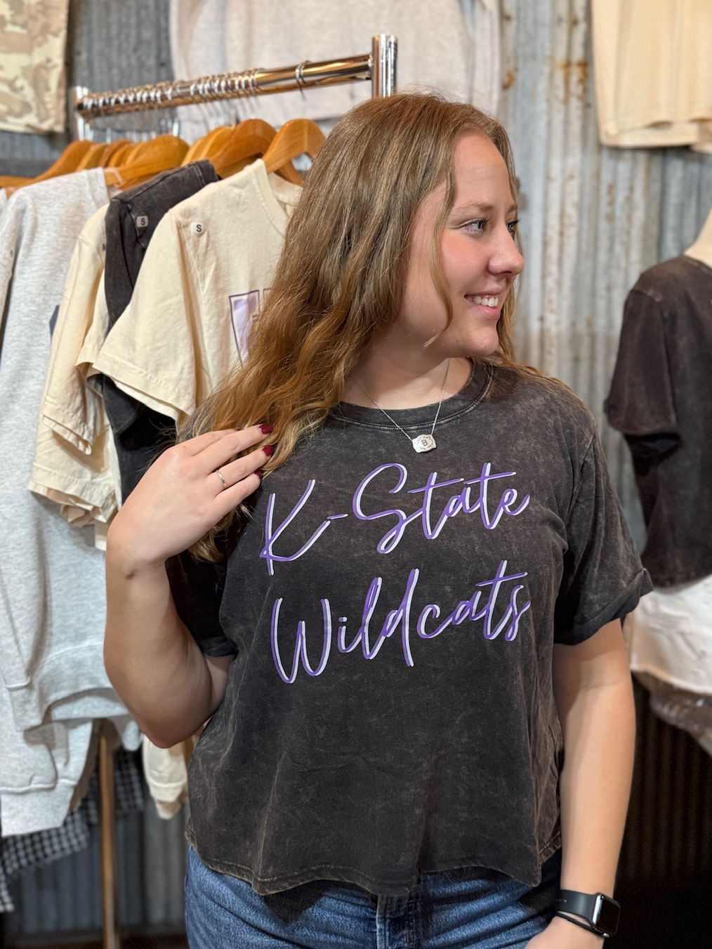 With its bold lavender “K-State Wildcats” print on a vintage black wash, this tee adds effortless style to any fan’s wardrobe—whether you’re tailgating, relaxing, or out on the town.