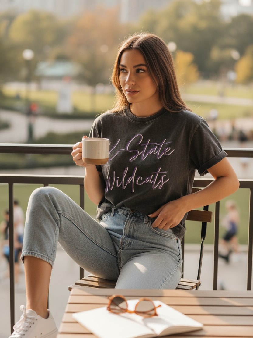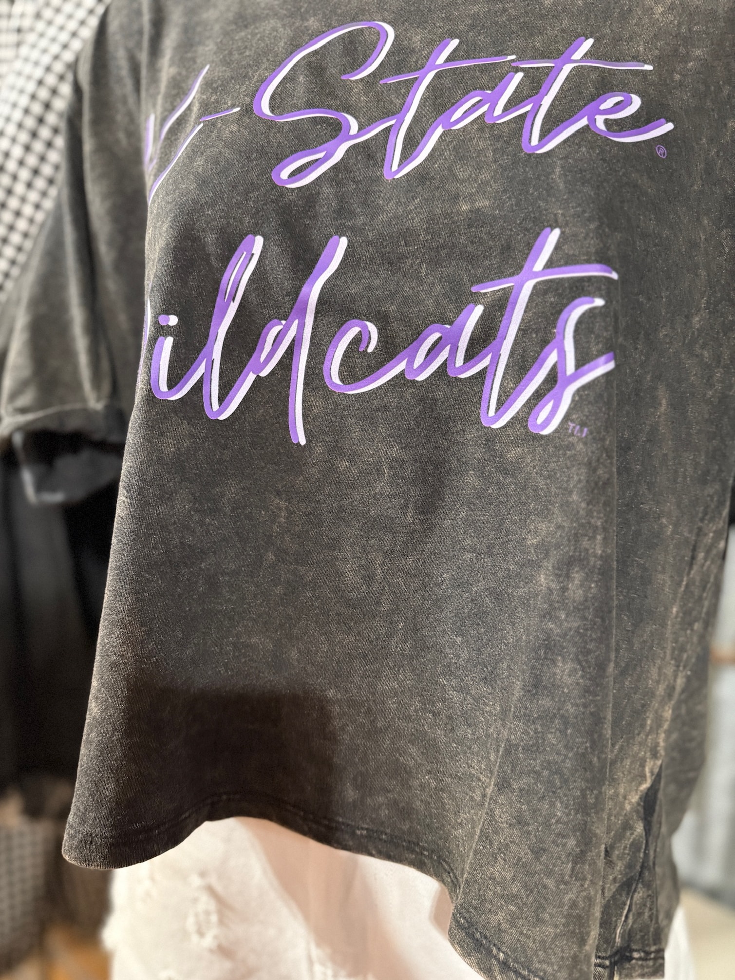 With its bold lavender “K-State Wildcats” print on a vintage black wash, this tee adds effortless style to any fan’s wardrobe—whether you’re tailgating, relaxing, or out on the town.