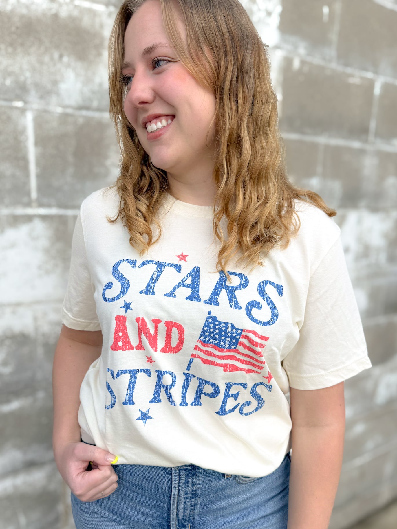 Wave your flag with style in our Stars and Stripes Graphic Tee. This all-American favorite features distressed red and blue lettering with a bold flag graphic—designed to channel vintage charm with a modern edge.