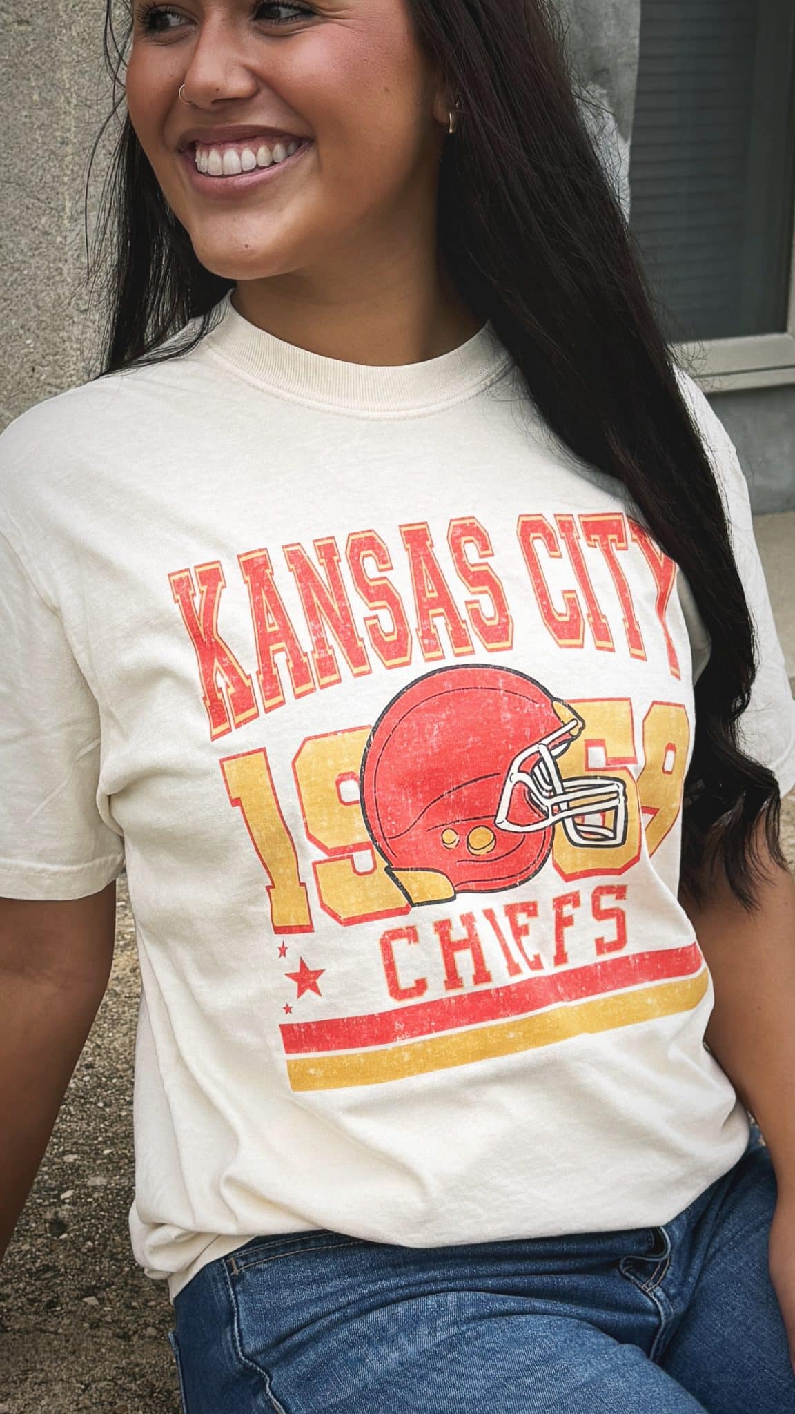 - Print: Vintage Kansas City helmet with bold lettering and 1969 detail