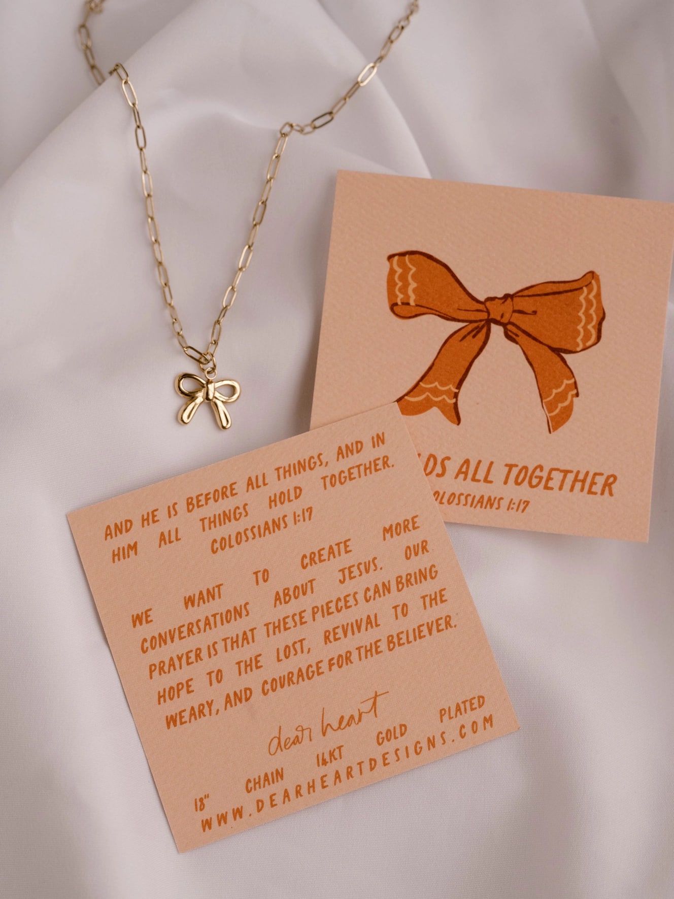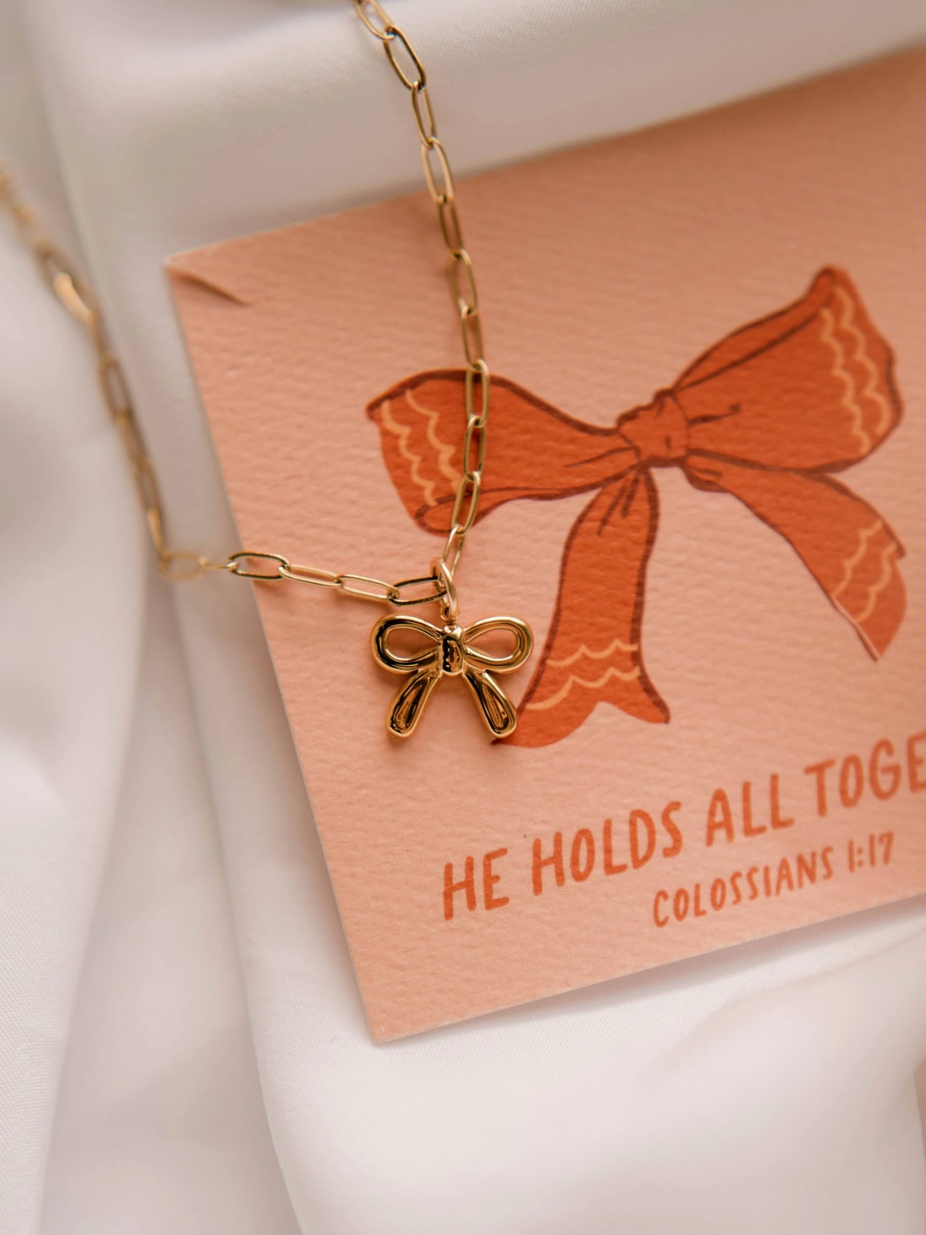 The He Holds All Together Bow Charm Necklace is a reminder of Colossians 1:17: “And He is before all things, and in Him all things hold together.” When life feels uncertain, this verse calls you to rest in His steady hands—He goes before you, stands behind you, and surrounds you on every side.