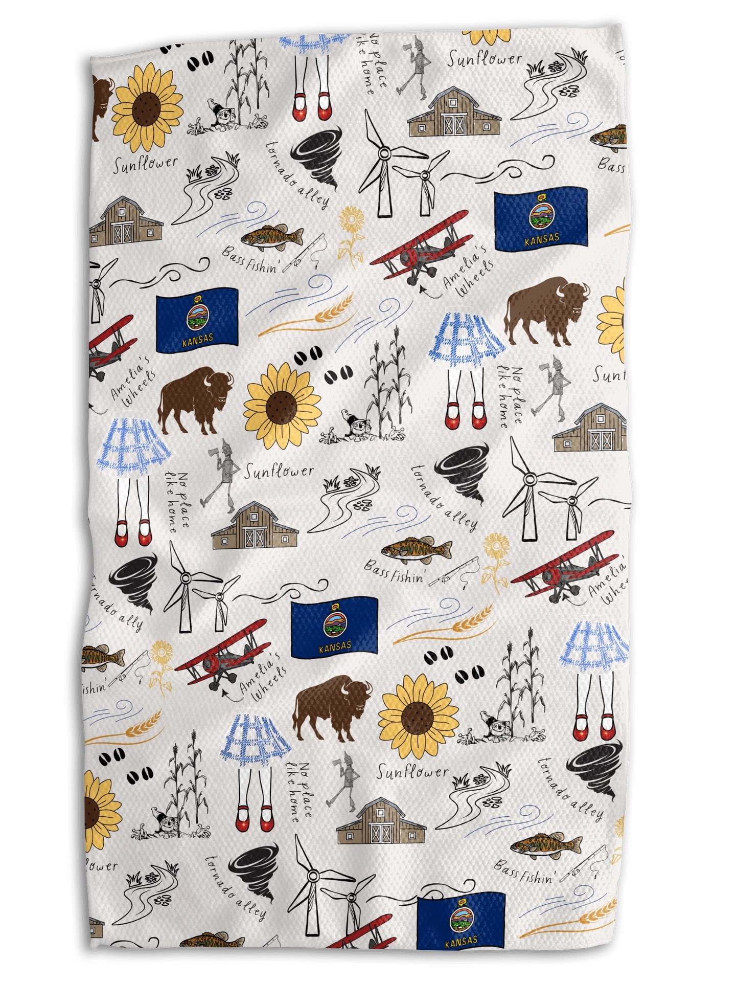 Add Kansas pride to your kitchen with the Kansas Icons Tea Towel. The design features state favorites like sunflowers, barns, buffalo, windmills, bass fishing, Amelia’s wheels, and Dorothy’s ruby slippers. It’s a playful nod to the Sunflower State.