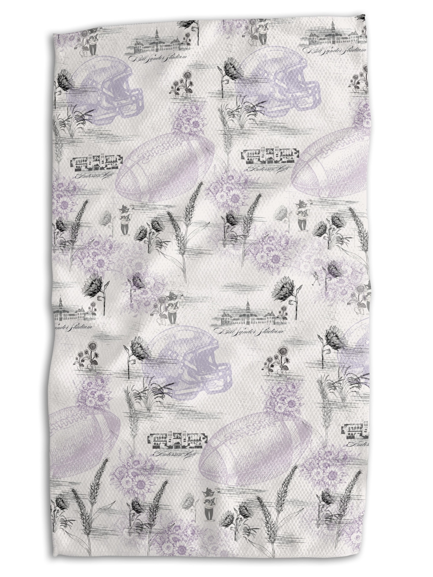 Show off your Wildcat pride with the KSU Football Tea Towel. Featuring vintage-inspired artwork with football helmets, fields of wheat, florals, and iconic Kansas State landmarks, this towel captures the energy of game day in Manhattan. A plaid reverse side in K-State purple adds a bold finishing touch.