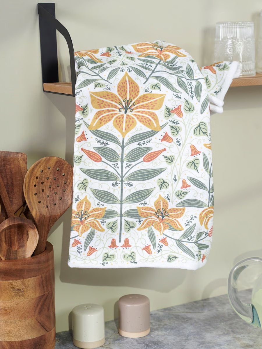 Brighten your kitchen with the bold, floral beauty of the Nouveau Lily Kitchen Towel. Designed with a colorful lily pattern, this towel blends style with everyday function. The cotton front showcases the detailed print, while the soft terrycloth backing adds absorbency for drying dishes and cleaning up spills. A convenient corner loop makes hanging easy, keeping this towel within reach for daily use.