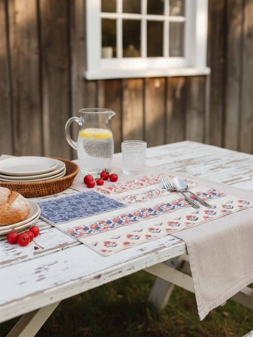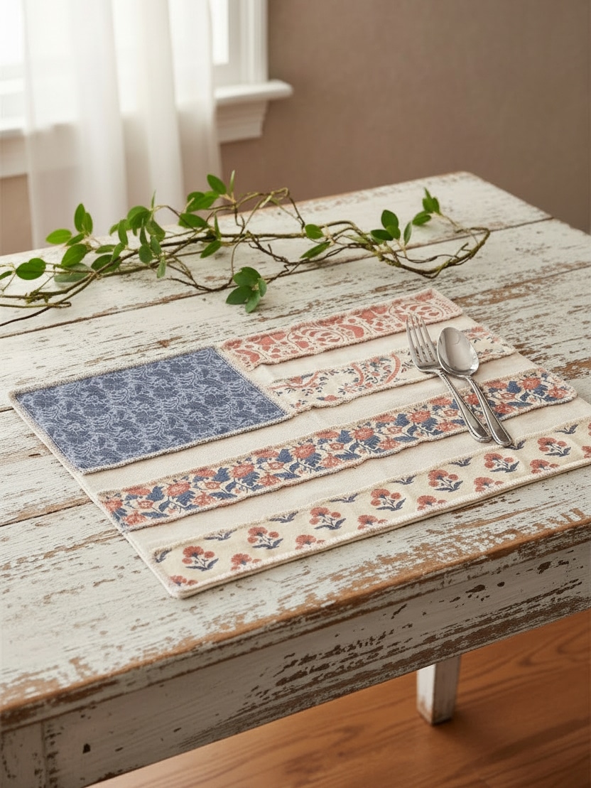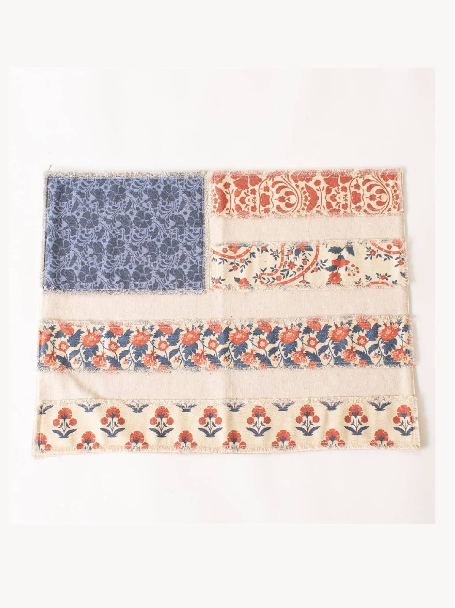 Add a cozy, vintage-inspired touch to your table with our Patchwork American Flag Placemat. Made with a mix of patterned fabric strips in classic red, white, and blue, this placemat has that collected, homespun look—perfect for summer gatherings, patriotic holidays, and everyday Americana style.