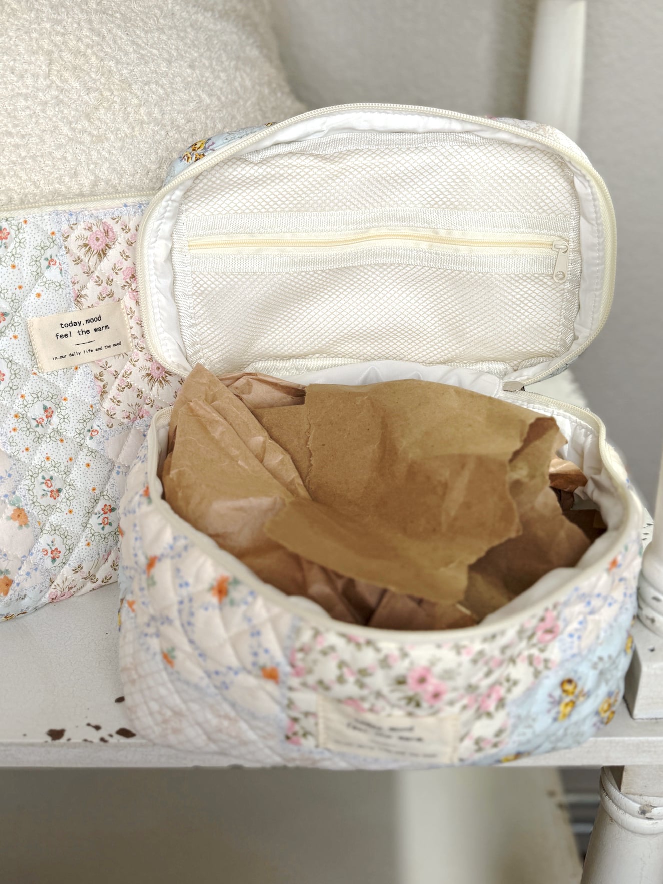 Whether you’re headed on a weekend getaway or just need a bit more room for your beauty favorites, the Quilted Floral Makeup Bag – Large is your travel-ready companion. With its soft patchwork floral print, quilted finish, and structured shape, this bag keeps your essentials stylishly contained.