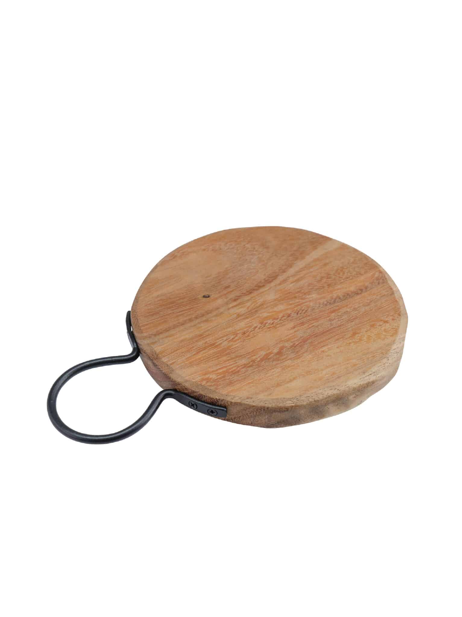 The Round Wood Serving Board brings handcrafted beauty and functionality together in one timeless piece. Made from durable acacia wood and finished with a bold black metal handle, this compact board is ideal for serving cheeses, small bites, or favorite treats. Its organic wood grain and natural shape offer rustic character, while the metal handle makes it easy to hang or carry.