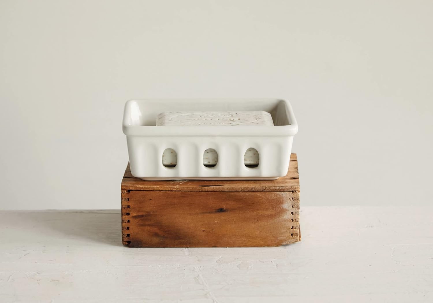 The White Stoneware Berry Bowl or Soap Dish is a versatile addition to your kitchen or bath. Made from durable stoneware with a clean white glaze, this multi-use piece brings both charm and function to your space. The open oval cutouts offer drainage or airflow—ideal for rinsing berries or storing bar soap.