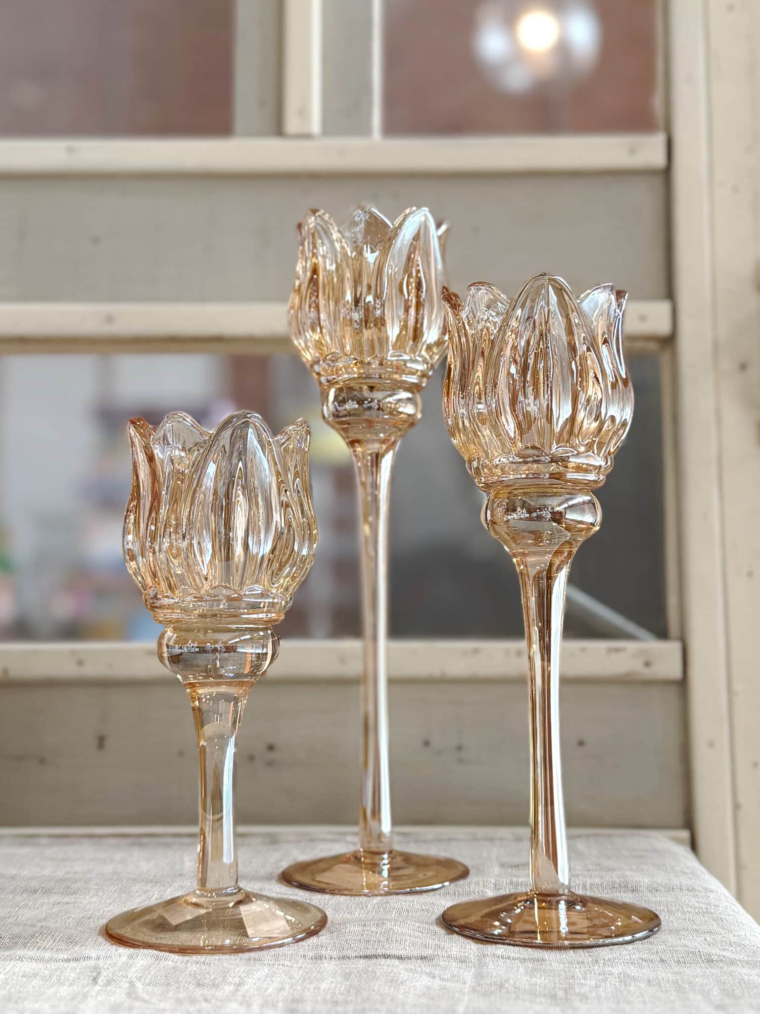 Bring a soft, garden-inspired glow to your space with the Tulip Glass Votive Candle Holders in Amber. Shaped like a tulip on a slender stem, this piece has the most gorgeous neutral amber tones. It does have a slight iridescent glow that feels warm and bright at the same time. I would keep these up year-round and match with gold and red for the holidays. Once lit, the glass catches and reflects candlelight beautifully, creating a warm, cozy flicker on tables, shelves, mantels, and evening centerpieces.
