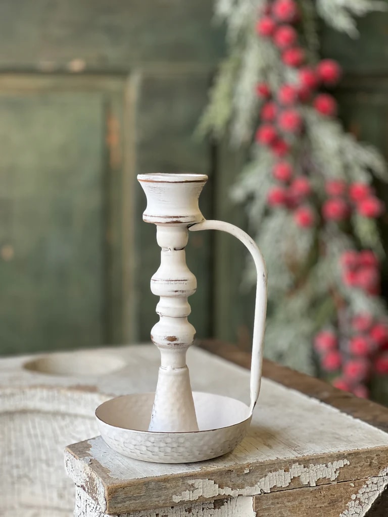 Bring old-world charm to your home with the Vintage Chamberstick Taper Candle Holder. Crafted from distressed white metal, this classic handled design feels straight out of a cozy cottage scene. The weathered finish adds soft character, making it an easy piece to style with farmhouse, vintage, or holiday décor.