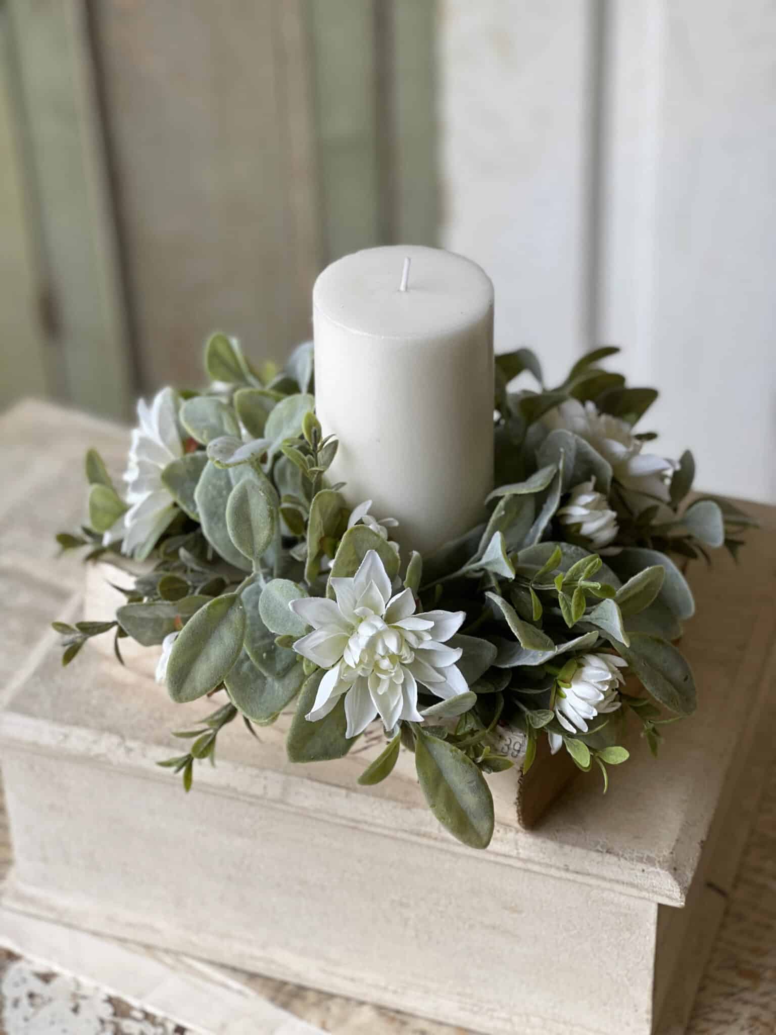 Create a soft, finished look with our White Cottage Blooms Candle Ring. Layered white blossoms rest among mixed greenery, adding natural texture without feeling overdone.