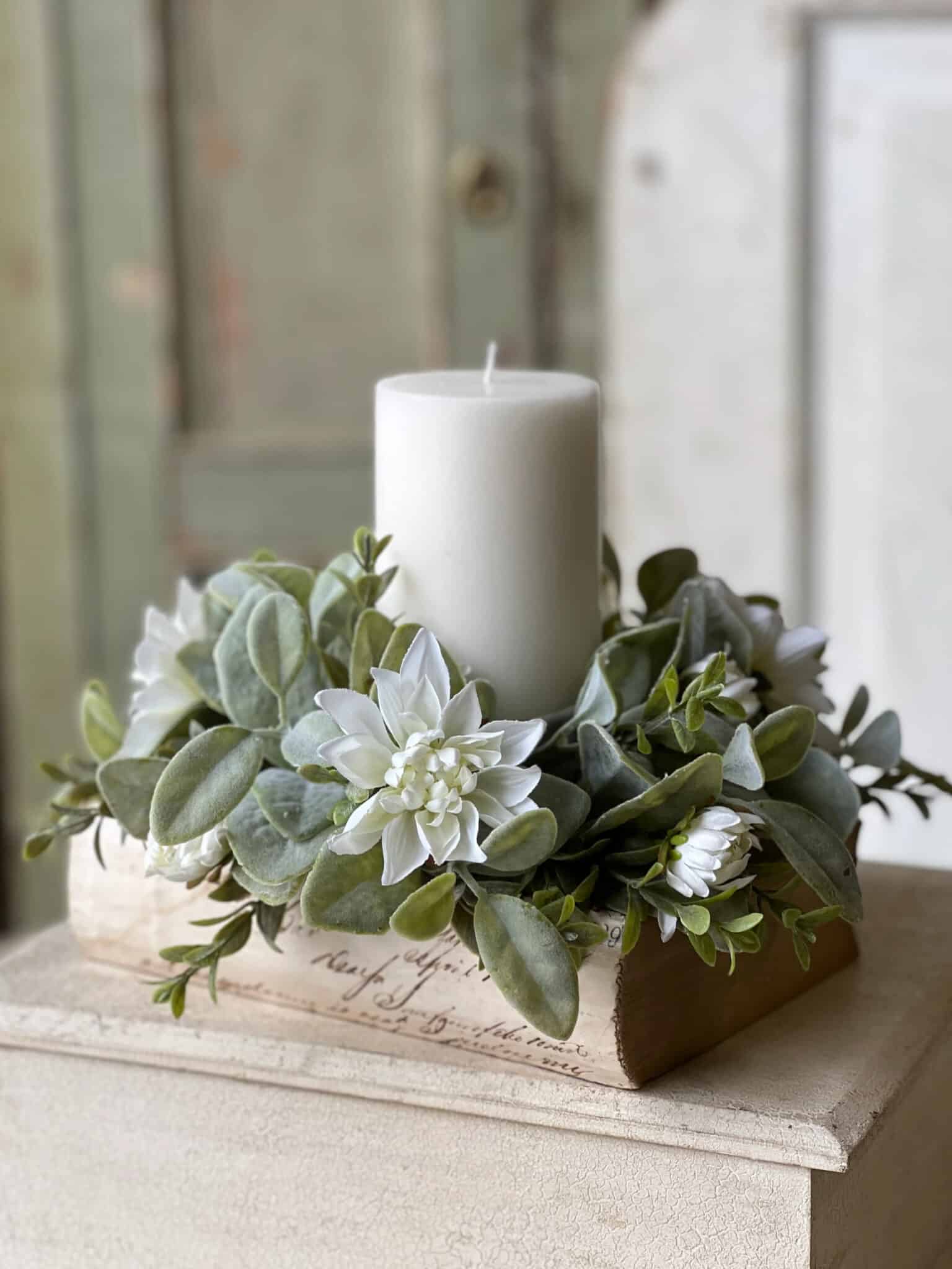 The rounded shape makes styling simple. Place it around a favorite candle, inside a bowl, or on a tray for instant charm. Muted greens ground the look, while white florals gently brighten the space.