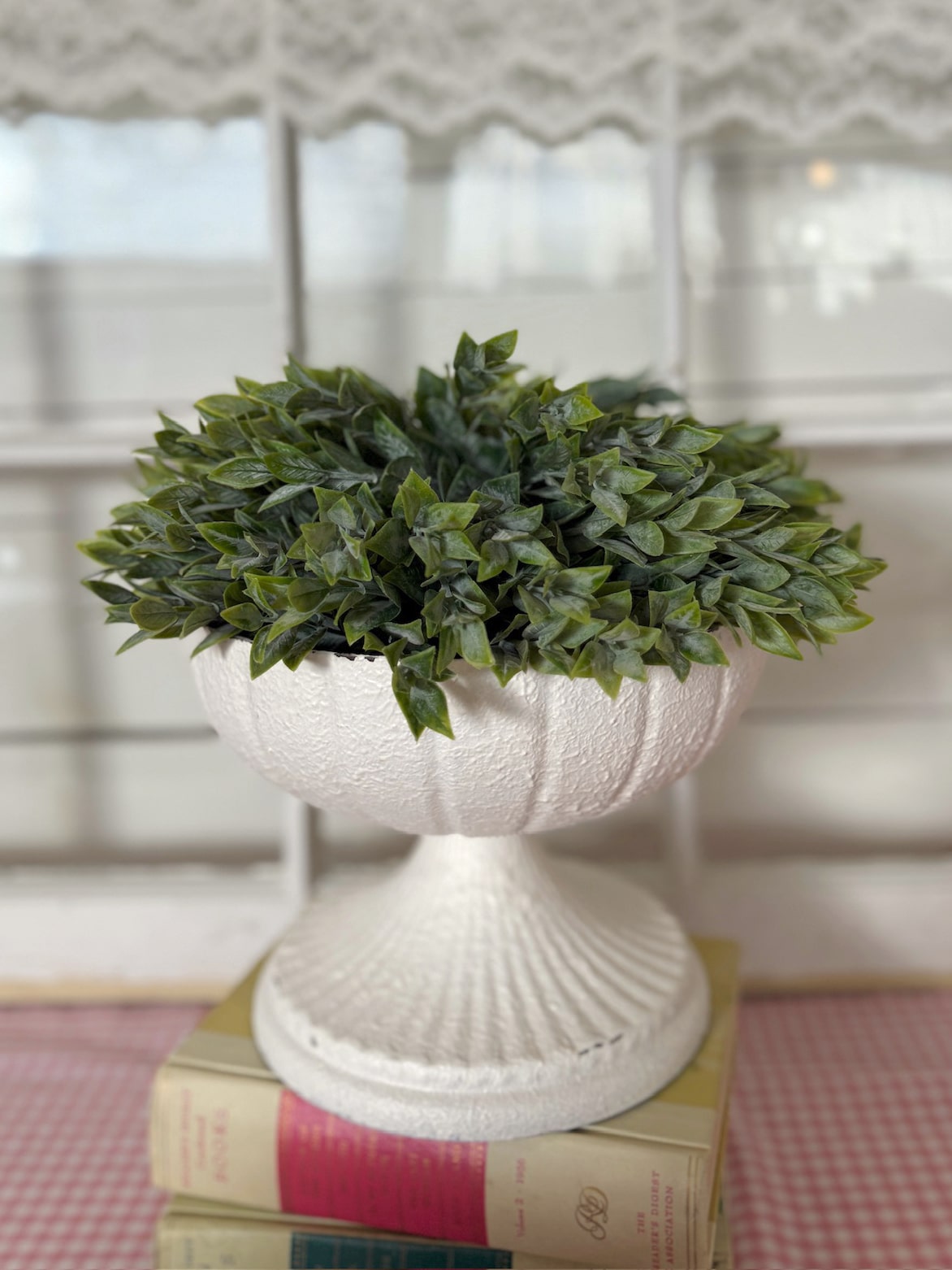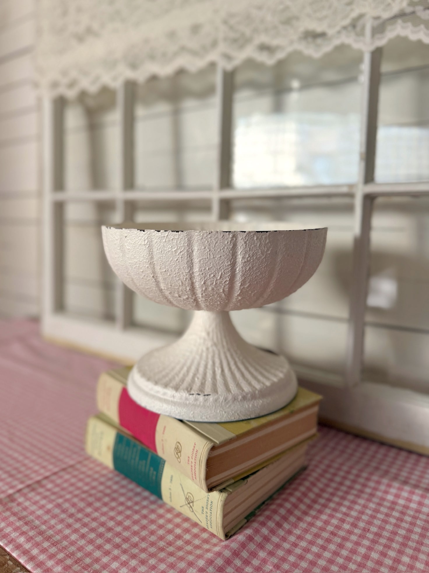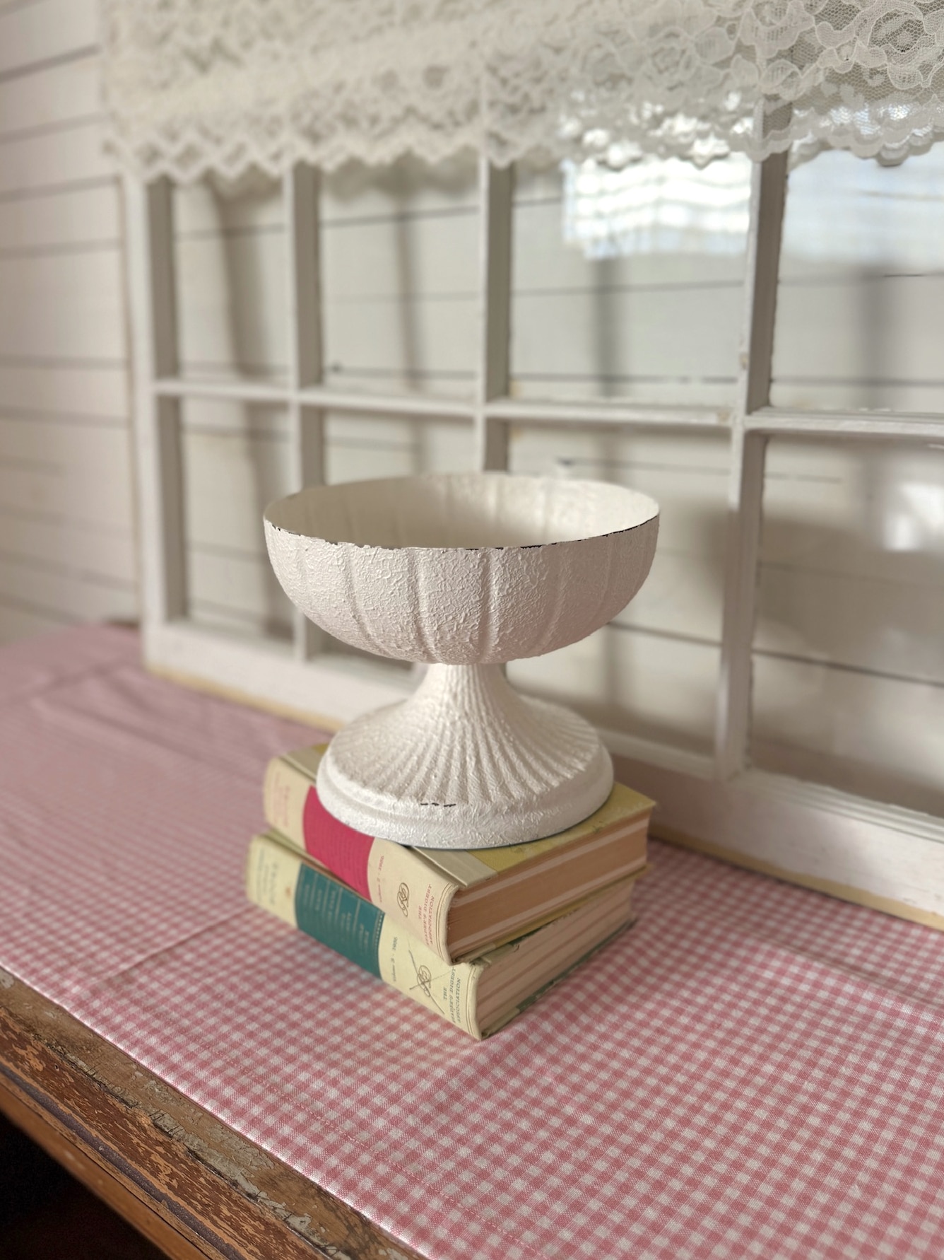 The White Metal Pedestal Bowl brings an instant collected look to your styling. The Serah Vessel shows off a lovely fluted base and a perfectly imperfect distressed finish. It adds texture without feeling heavy.