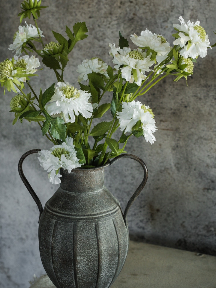 The White Scabiosa Spray brings a soft, timeless beauty to your floral arrangements. With layered white blooms and realistic green leaves, this lifelike spray adds texture and brightness to any space. The delicate petals and natural movement create an effortlessly elegant look that pairs well with other florals or stands beautifully on its own.